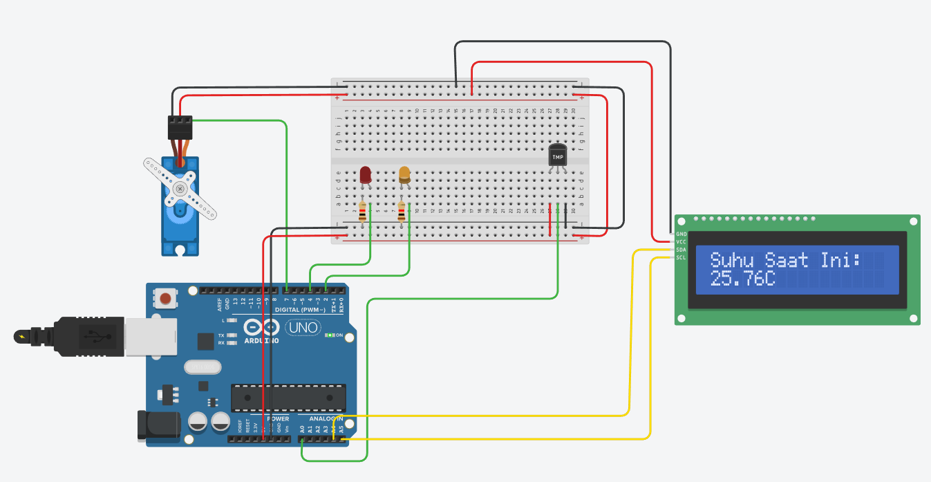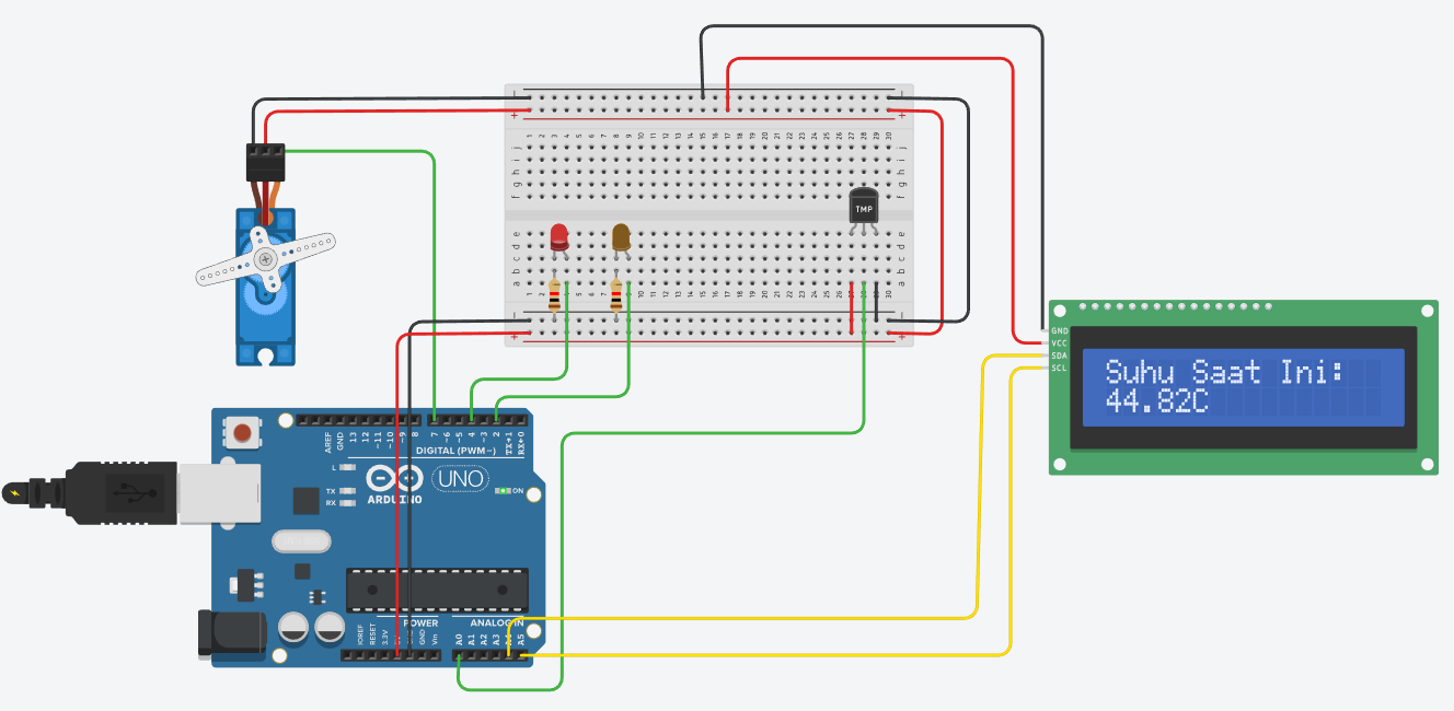 Arduino project for auto fan, fan will start when temperature higher than 30°C and the microservice will be removed 110°. If the temperature is between 25°C and 30°C, the micro servo will move 50°. in this simulation I use a micro servo as a switch on the fan. when the micro servo is at 110°, the micro servo will press the fan switch